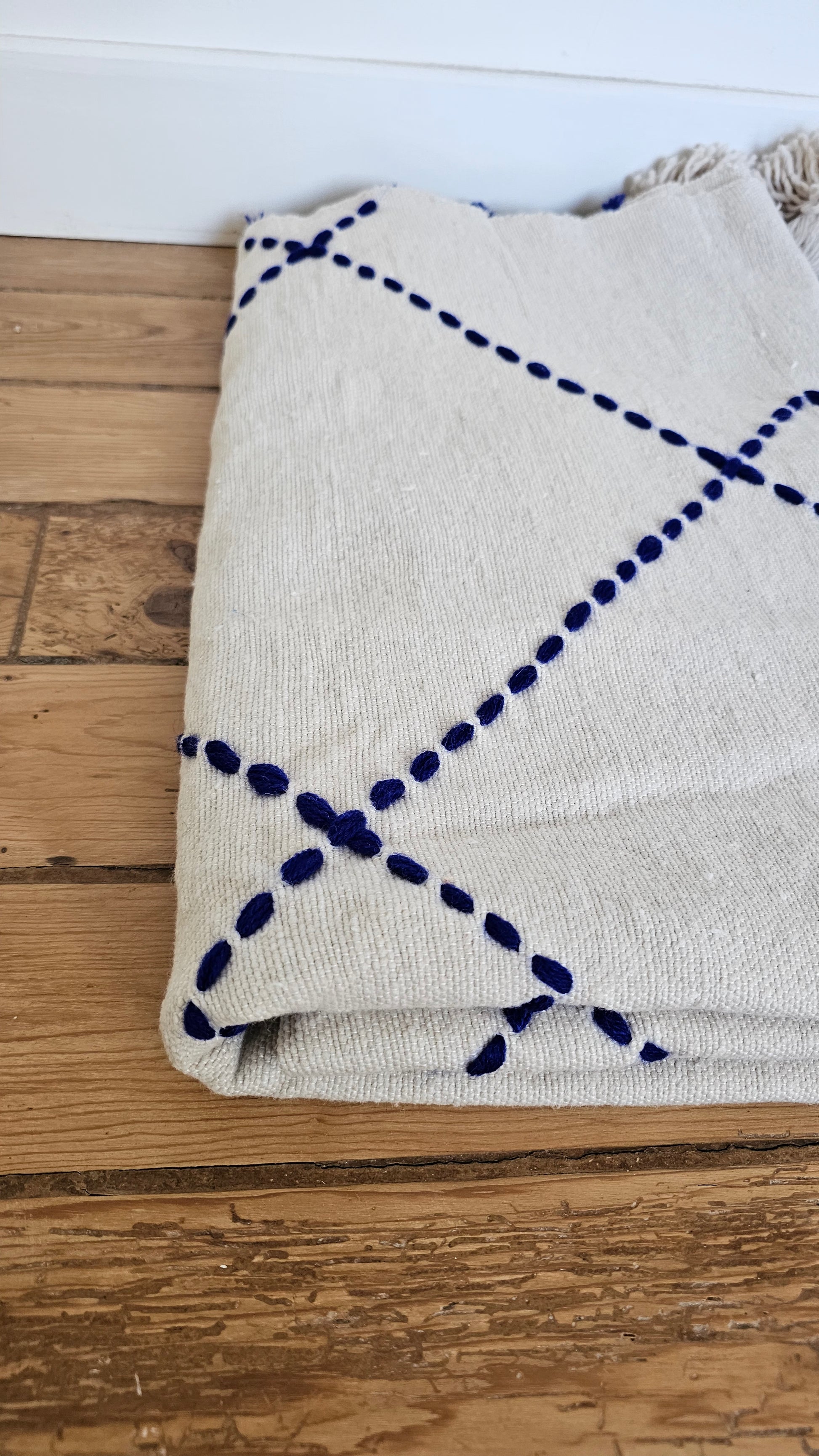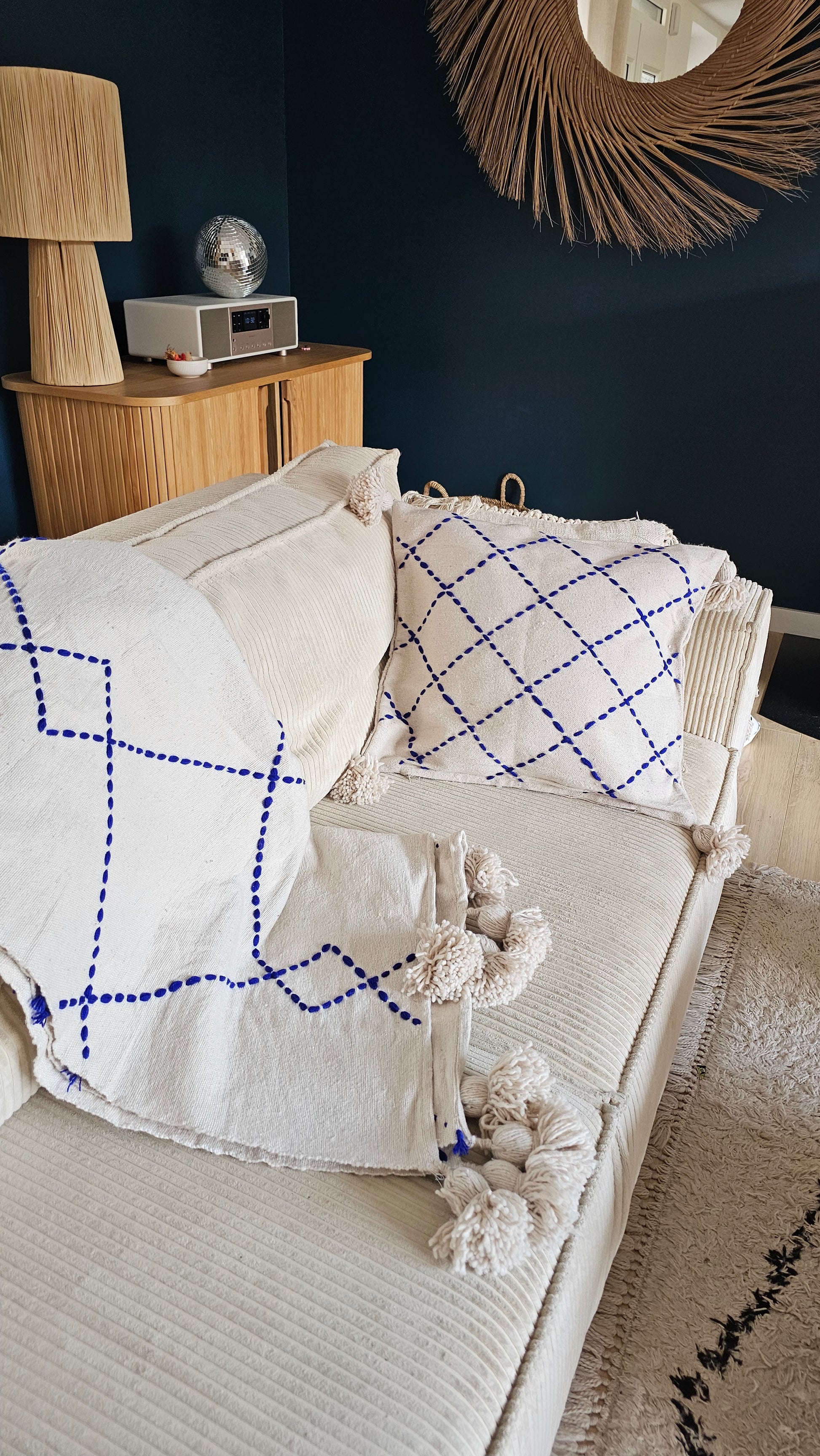 Entrez dans l'hiver avec douceur avec ce plaid en coton tissé à la main au Maroc. Une jolie pièce unique et artisanale qui habillera votre canapé ou le bout de votre lit avec raffinement. Les broderies bleu majorelle vous rappelleront le Maroc, réalisées à la main par des femmes marocaines, elles lui donnent un style authentique qui se mariera parfaitement à votre interieur.