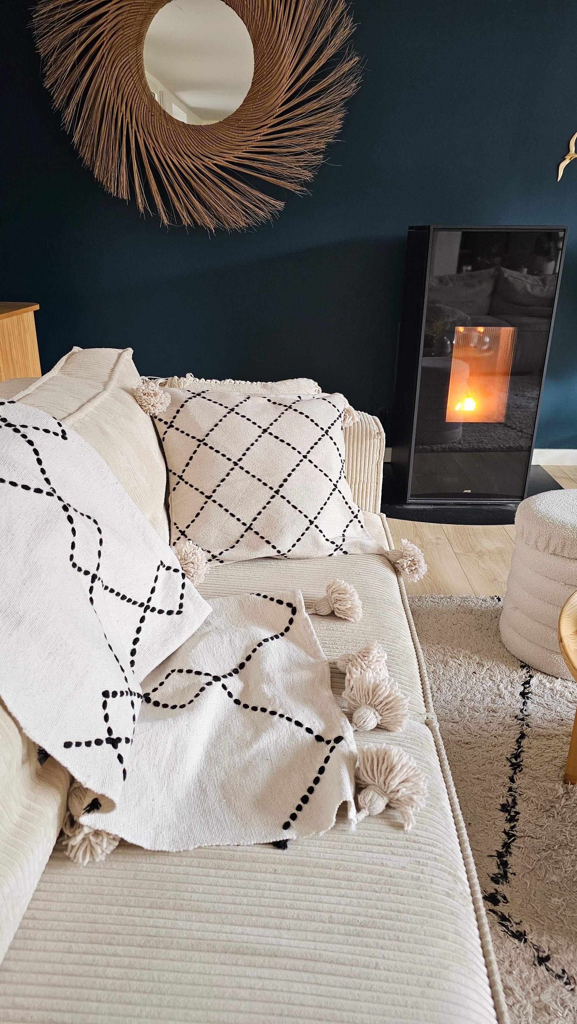Entrez dans l'hiver avec douceur avec ce plaid en coton tissé à la main au Maroc. Une jolie pièce unique et artisanale qui habillera votre canapé ou le bout de votre lit avec raffinement. Les broderies noires réalisées à la main par des femmes marocaines, lui donnent un style authentique qui se mariera parfaitement à votre interieur.