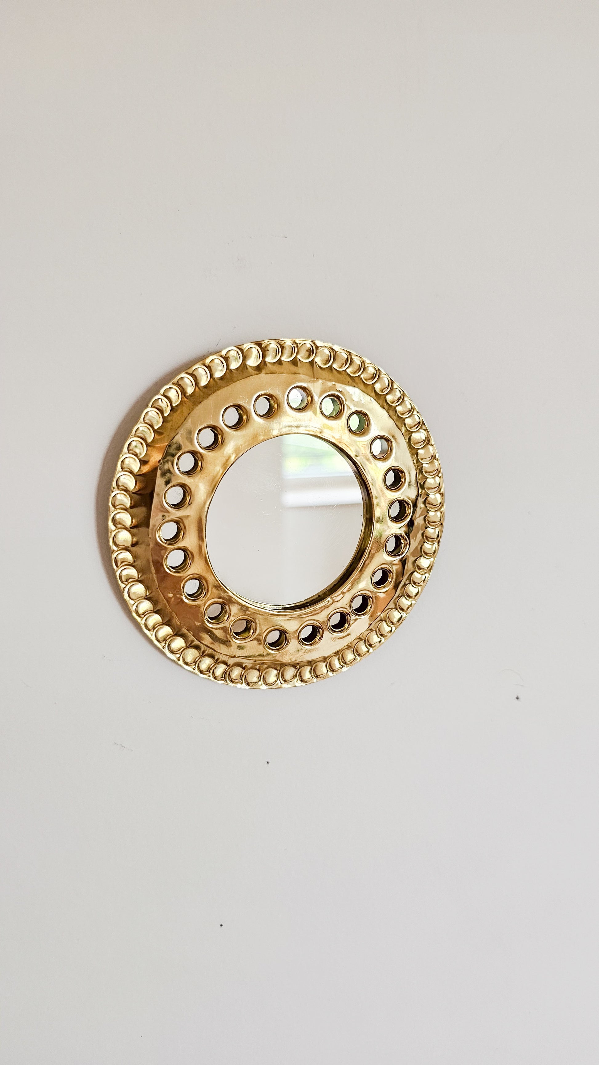 Petits miroirs en cuivre dorés façonnés entièrement à la main par des artisans marocains.